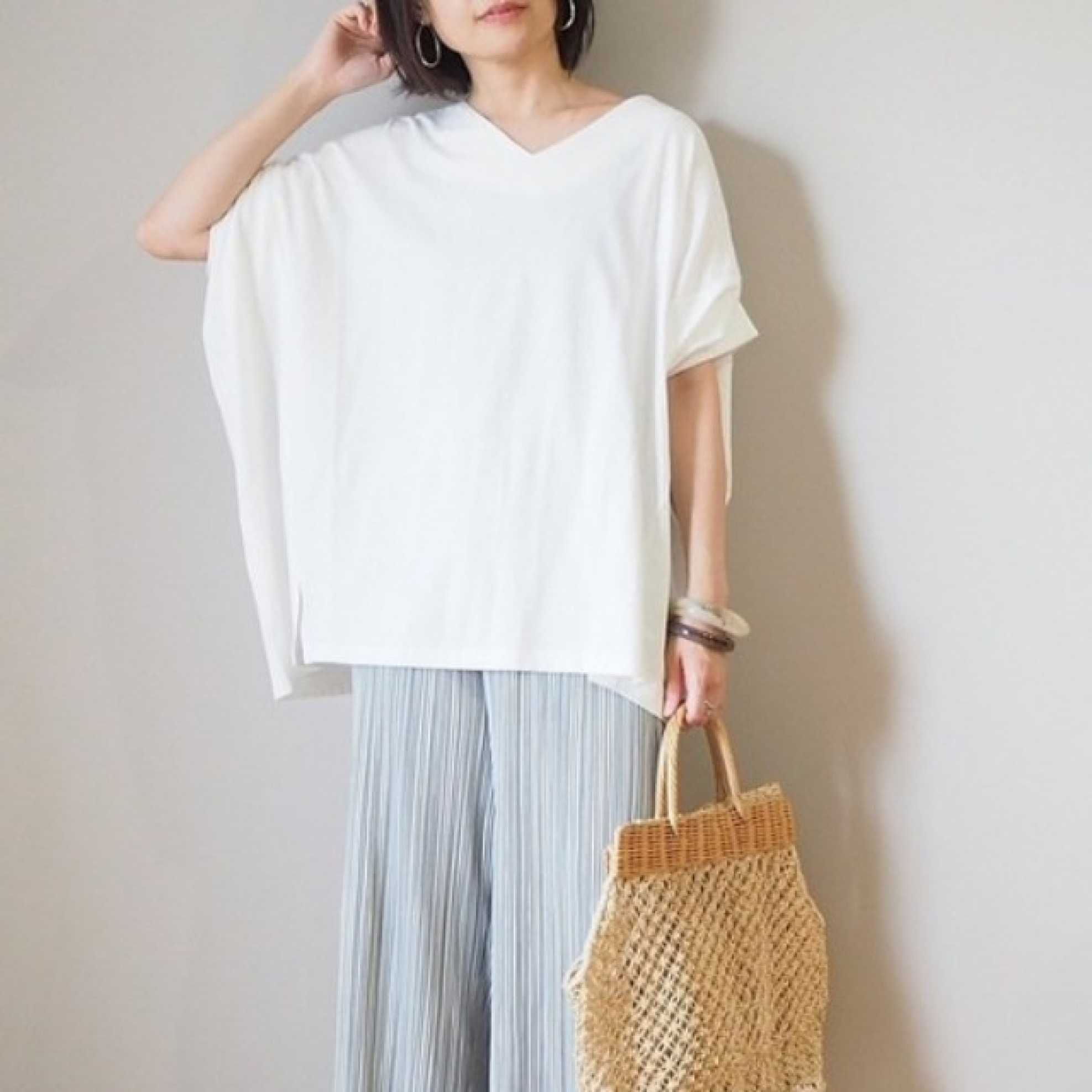 トップスをコンパクトに、ボトムスは裾に向かって広がるようなバランスは、脚を長く、着痩せして見せてくれる鉄板の組み合わせ。写真はそのシルエットにならい、前を開けても着られる薄手のジャストサイズのトップスに、センタープレスライン入りで脚をすらっと見せてくれるワイドパンツを合わせた着こなしです。 この場合、多少トップスにはゆとりをもたせて、幅があるものでもOK。ですが、丈は短めを選ぶのがコツ。縦が長くなってしまうと、その分脚も短く見えてしまいやすいため、上半身をコンパクトにまとめるのが一番のポイントです。