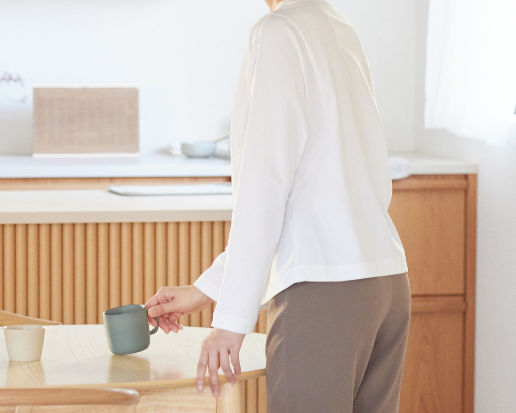 表はサラっとなめらかな質感で、ズボンを履いてももたつきません。一方で、肌に直接触れる内側は、ふんわりやわらかい肌触りの綿素材を使用。